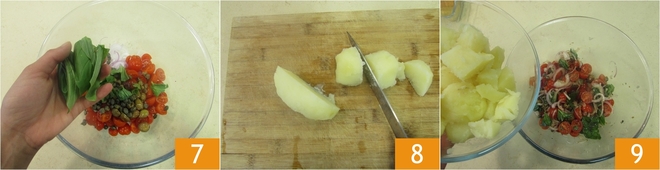 Sazona con las hojas de albahaca troceadas con las manos 7 y el orégano seco. Mientras, las patatas estarán listas, escúrrelas, pélalas y deja que se enfríen, luego córtalas en trozos 8. Añade las patatas al resto de los ingredientes 9.