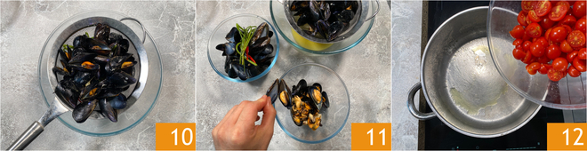 Escúrrelos y filtra el líquido de cocción que reservarás 10, luego deja que se templen antes de pelarlos (reserva algunos enteros para decorar el plato) 11. En la misma cazuela donde has abierto los mejillones, agrega un poco de aceite y cuando el fondo esté de nuevo caliente, añade los tomates cherry 12.