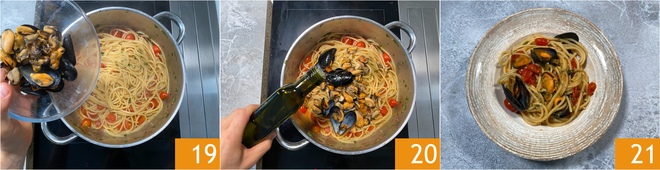 Con el fuego apagado, añade los mejillones 19 y un chorrito de aceite 20, mezcla y sirve tus espaguetis con mejillones y tomates cherry bien calientes 21.