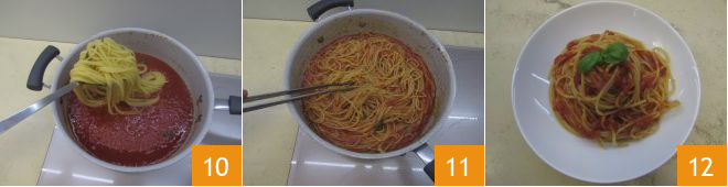 Vuelve a poner la salsa en la sartén 7, enciende el fuego muy bajo y añade las hojas de albahaca 8. Después de unos minutos, puedes apagar la salsa y mantenerla caliente. A continuación, solo queda cocinar la pasta en abundante agua hirviendo con sal 9.