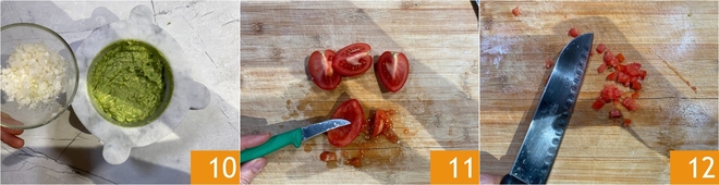 Añade al mortero la cebolla finamente picada 10 y encárgate de los tomates. Córtalos en cuatro cuartos y quita las semillas internas 11, luego córtalos en cubos de medio centímetro 12.