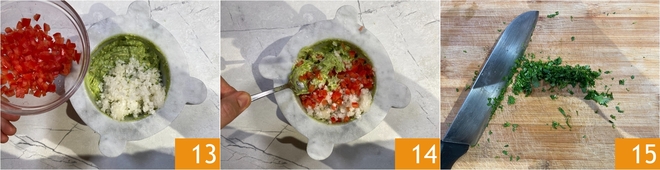 Enriquece el guacamole con los tomates cortados 13 y da una buena mezcla 14. Ahora pica finamente el cilantro 15.