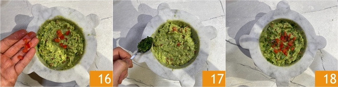 Termina con más cubos de tomate 16, una pizca de cilantro 17 y tu guacamole está listo para ser servido 18!