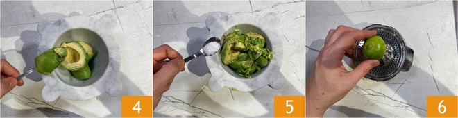 Transfiere en un mortero grande el aguacate 4 y sazona con la sal fina 5. Corta una lima por la mitad y exprime su jugo 6.