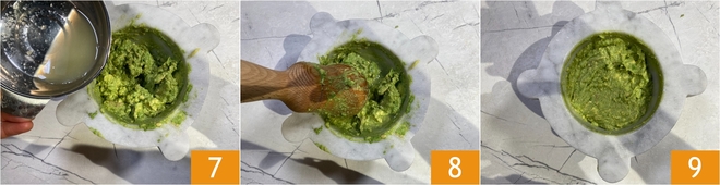 Para sazonar y evitar que se oxide el aguacate, vierte el jugo de lima en el mortero 7. Con el mazo, comienza a machacar suavemente 8. Después de unos 2 minutos habrás obtenido una consistencia cremosa 9.