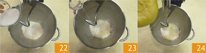 Mientras tanto, bate juntos los huevos y las yemas, ambos a temperatura ambiente 25. Cuando el agua se haya absorbido completamente, añádelos a la masa poco a poco 26. Después de unos minutos, añade la sal 27.
