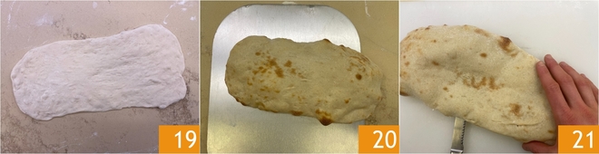 Debéis obtener una forma rectangular de aproximadamente 30x10 cm 19. Colocad la masa estirada sobre la piedra refractaria ayudándoos con la pala y hornead durante 2-3 minutos a 250°. Cuando el panuozzo se haya inflado, retiradlo del horno 20 y cortadlo por la mitad horizontalmente 21.