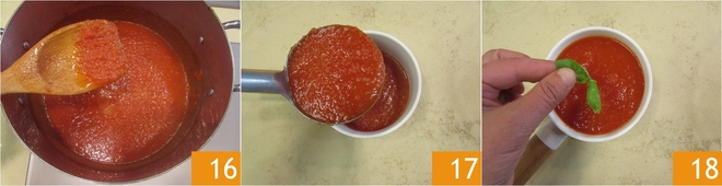 Verifica que la salsa haya alcanzado la densidad adecuada 16, transfiérela a un recipiente 17, añade una hojita de albahaca 18 y úsala como prefieras.