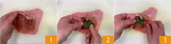 Para preparar los saltimbocca a la romana, primero golpead ligeramente las lonchas de ternera hasta dejarlas de medio centímetro de grosor, de modo que queden más tiernas. Colocad encima de cada una una loncha de jamón crudo 1 y una hoja de salvia 2, y luego pinchad todo con un palillo para mantenerlos juntos 3.