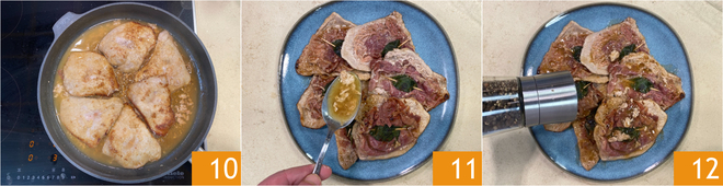 Dejad evaporar el vino y apagad el fuego 10. Emplatad los saltimbocca rociándolos con el fondo de cocción 11, luego completad con un molido de pimienta 12. ¡Vuestros saltimbocca a la romana están listos para ser degustados!