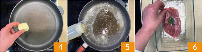 Dejad derretir la mantequilla en una amplia sartén antiadherente 4, luego añadid también el aceite 5. Mientras tanto, enharinad las lonchas de carne solo por el lado sin jamón 6 y eliminad el exceso de harina.