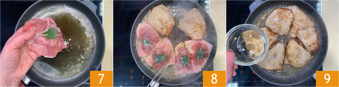 Id colocando las lonchas en la sartén con el lado del jamón hacia arriba 7 y coced a fuego medio-alto durante 3 minutos, sin tocarlas. Una vez doradas, dadles la vuelta 8 y continuad la cocción durante un minuto. En ese momento, añadid el vino blanco 9.