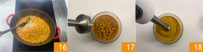 Elimina el manojo de hierbas 16, luego ajusta de sal y pimienta. Extrae un cucharón de garbanzos con un poco de su agua y tritura con la batidora de inmersión 17 para obtener una crema 18.