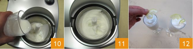 Vierte la mezcla en tu heladera (sigue las instrucciones de tu heladera para verificar cómo proceder) 10 y enciéndela. Tan pronto como el sorbete alcance la clásica consistencia cremosa, tomará aproximadamente 40 minutos 11, puedes transferirlo a vasos y servir tu sorbete de limón con unas ralladuras para decorar 12.