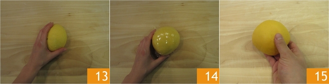 Schiacciatela con le mani per appiattirlo e dare una forma rotonda 16, poi stendetela con un mattarello lungo 17 fino ad ottenere una sfoglia molto sottile 18. Talmente sottile che sollevandola dovrete riuscire ad intravedere ciò che c'è dietro.
