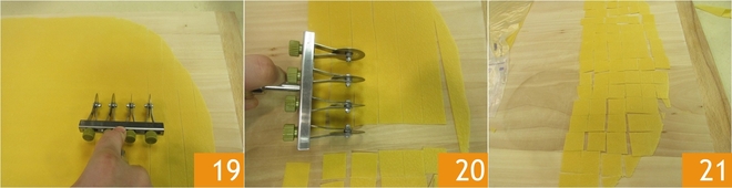 Utilizzando una rotella tagliapasta (o quella che si definisce una "bicicletta da cucina") realizzate prima delle strisce verticali 19, poi altre orizzontali 20 in modo da ottenere dei quadratini 21. Questi dovranno avere un lato di 2,5-3 cm al massimo.