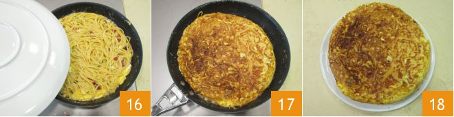 Elimina el diente de ajo y vierte los espaguetis 13. Distribúyelos de manera uniforme con una espátula 14, luego cocina a fuego alto durante 1 minuto para que la base se cuaje, después baja el fuego, cubre con la tapa y cocina durante 15 minutos 15.