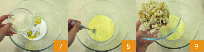 En este punto, adereza con el queso rallado 7 y mezcla bien para obtener una mezcla homogénea 8. Incorpora el relleno 9 y mezcla de nuevo.