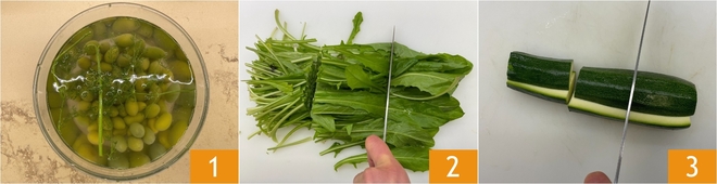 Para preparar las aceitunas ascolanas vegetarianas, primero enjuaga las aceitunas y déjalas en remojo toda la noche junto con unas ramitas de hinojo fresco 1. Prepara el relleno: limpia y corta groseramente las achicorias 2 y el calabacín 3.