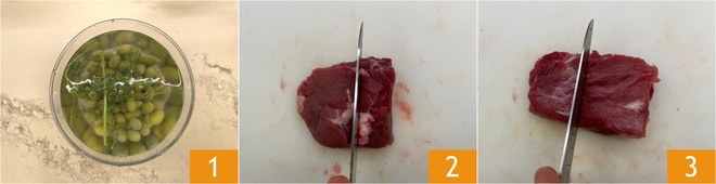 Para preparar las aceitunas a la ascolana, primero mantén las aceitunas en remojo durante 12 horas en agua aromatizada con hinojo fresco 1. Ocúpate de la carne para el relleno: corta en trozos pequeños la carne de res 2 y la de cerdo 3.