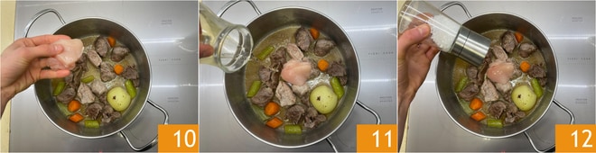 Ahora añade también la pechuga de pollo 10, vierte el vino 11 y sal 12.
