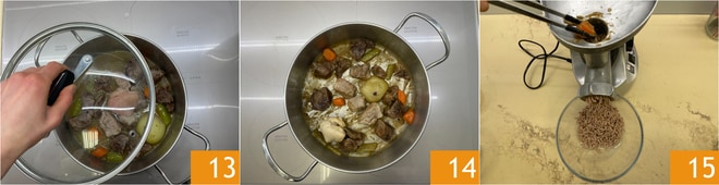 Cocina ahora durante una hora con la tapa 13. Transcurrido este tiempo, apaga el fuego y deja enfriar 14. Elimina los clavos de olor de la cebolla y pasa todo por la picadora.