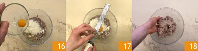 Transfiere la carne picada a un bol y añade el Parmigiano Reggiano DOP rallado y el huevo 16, sazona con la nuez moscada rallada 17 y amasa con las manos para obtener una mezcla homogénea 18.