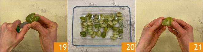 Ahora corta las aceitunas en espiral para eliminar el hueso 19 20. Pasa al relleno: abre las aceitunas 21.