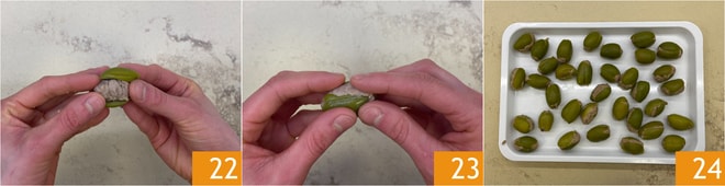 Rellena las aceitunas con la mezcla 22 y ciérralas 23 para recrear la forma original 24.