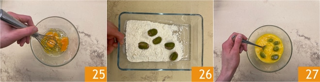 Ahora ocúpate del empanado: bate los huevos con la sal 25, luego pasa las aceitunas rellenas primero por la harina 26, luego por los huevos 27.