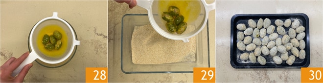 Escurre para eliminar el exceso de huevo 28 y finalmente pasa las aceitunas por el pan rallado 29. Colócalas en una bandeja 30.