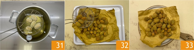 Para terminar, pasa a la fritura: calienta el aceite de semillas y cuando haya alcanzado una temperatura de 180°, sumerge las aceitunas 31. Cocínalas durante unos 2 minutos, el tiempo suficiente para dorarlas, luego escúrrelas en una bandeja forrada con papel absorbente 32 y sirve las aceitunas a la ascolana ligeramente tibias 33!