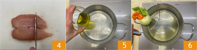 Reduce a trozos también la pechuga de pollo 4. En una cacerola vierte un poco de aceite 5, luego añade la zanahoria y el apio cortados groseramente junto con media cebolla en la que habrás insertado los clavos de olor 6. Deja sofreír las verduras por unos minutos.