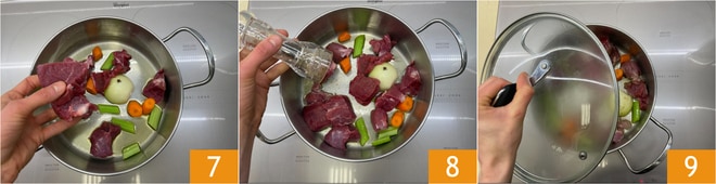 Luego añade también la carne de res y la de cerdo 7, pimienta 8, cubre con la tapa y cocina durante unos 20 minutos 9.