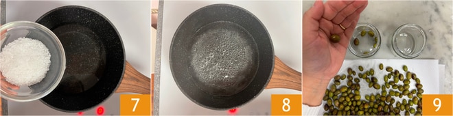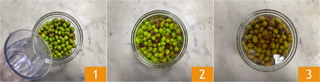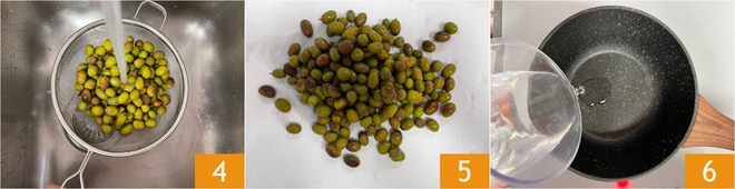 Escurre las aceitunas del agua, enjuágalas 4 y colócalas sobre un paño limpio de algodón para secarlas 5. Prepara la salmuera vertiendo agua en una cacerola pequeña 6.