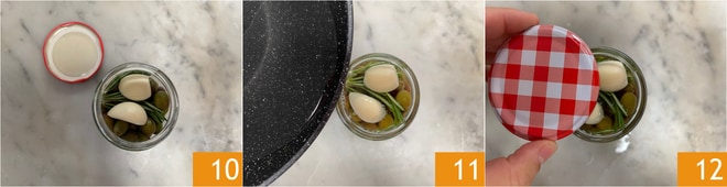 Sazona con ajo y romero 10 y, tan pronto como la salmuera esté fría, viértela sobre las aceitunas 11. Cierra con la tapa 12 cada frasco y almacénalos en un lugar fresco y seco, protegido de la luz. Deja que tus aceitunas en salmuera adquieran sabor durante al menos un mes antes de consumirlas.