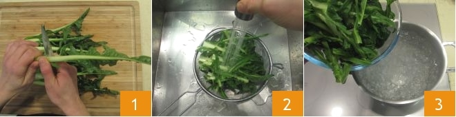Para preparar la achicoria en la sartén, primero pon a hervir una olla con abundante agua que te servirá para cocer la achicoria, luego pasa a limpiarla: elimina la base de la cabeza junto con la parte final de los tallos y las hojas dañadas 1, luego enjuágala cuidadosamente bajo agua corriente 2. Cuando el agua esté hirviendo, añade la achicoria 3 y escáldala durante 5 minutos.