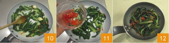 y sigue cocinando a fuego lento durante unos diez minutos, removiendo a menudo 10. Una vez lista, apaga el fuego, retira los dientes de ajo y añade el resto del chile fresco picado 11. ¡Tu achicoria en la sartén está lista para ser servida bien caliente 12!