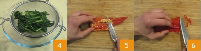 Pasado este tiempo, toma una taza del agua de cocción de la achicoria y resérvala, luego escúrrela y coloca el colador sobre un bol para recoger el exceso de agua 4. Mientras tanto, divide el chile por la mitad, elimina las semillas internas 5 y córtalo en tiras 6.