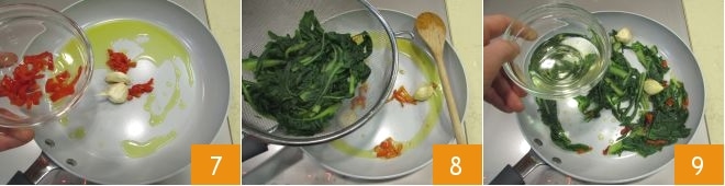 Ahora vierte el aceite en una sartén, añade los dientes de ajo con piel ligeramente machacados junto con parte del chile 7 y deja sofreír a fuego moderado durante unos minutos, removiendo de vez en cuando, luego añade la achicoria cocida y escurrida 8, sala y mezcla. Luego vierte un poco del agua de cocción de la achicoria que habías reservado 9