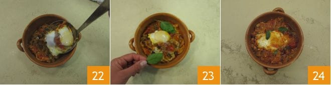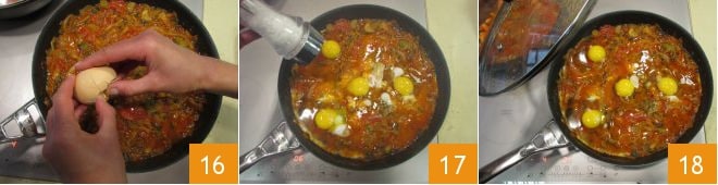 Cuando el aceite haya aflorado en la superficie añade unas hojitas de albahaca y agrega los huevos rompiéndolos directamente en la sartén 16. Dispónlos distanciándolos entre sí. Ajusta de sal 17 y cubre con una tapa 18.