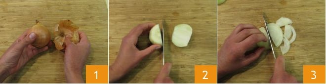 Para preparar la acqua cotta como primer paso prepara el Caldo de verduras y mantenlo caliente. Comienza pelando las cebollas 1, luego córtalas por la mitad 2 y rebánalas finamente 3.