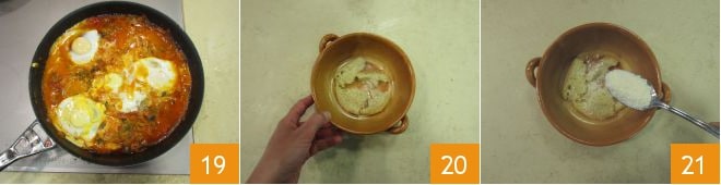 Deja cuajar los huevos, tardará unos 4-5 minutos 19. Mientras tanto rompe una rebanada fina de pan toscano duro en cada cocotte. Podrás romperlo con las manos y disponerlo de modo que cubra el fondo 20. Añade encima el pecorino rallado 21