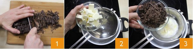 Para realizar los árboles de Navidad brownies comience preparando el pastel: con la ayuda de un cuchillo corte en trozos bastante pequeños el chocolate negro 1. Derrita al baño maría la mantequilla 2, a fuego bajo, luego añada el chocolate 3: