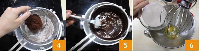 cuando comience a derretirse, agregue el cacao amargo en polvo 4. Continuando a mezclar, deje que todo se derrita hasta formar una crema espesa y sin grumos 5. Cuando los ingredientes estén completamente mezclados, apague el fuego y deje templar. Aparte monte los huevos con el azúcar, utilizando una batidora de pie o una batidora eléctrica 6,