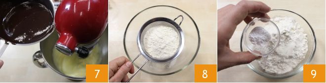 luego añada poco a poco la mezcla de chocolate ya templada 7. En un bol tamice la harina 8, añada la levadura 9, una pizca de sal y mezcle bien para amalgamar todos los ingredientes.