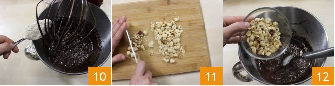 Agregue la harina con la levadura a la mezcla de chocolate 10, una cucharada a la vez, mezclando bien y teniendo cuidado de no formar grumos. En una tabla de cortar trocee groseramente las avellanas 11, ayudándose con un cuchillo, luego añádalas también a la masa 12.