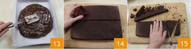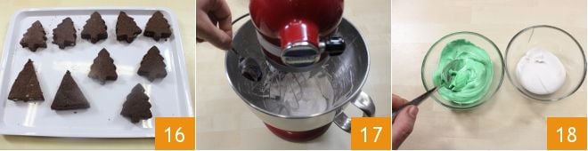 Vierta ahora la mezcla en un molde rectangular de 20cm x 28cm, forrado con papel de horno 13, y hornee todo en horno caliente, estático, a 180° durante 20 minutos. Cuando el pastel esté listo, déjelo reposar unos diez minutos antes de sacarlo del molde. Pasado este tiempo corte por la mitad el brownie, ya frío, horizontalmente y obtenga de los dos rectángulos obtenidos 10 arbolitos, utilizando un cortador con forma de galleta 14. Si no tiene el cortador puede cortar el pastel en triángulos iguales 15 (la base de 7-8 cm y los lados 9 cm).