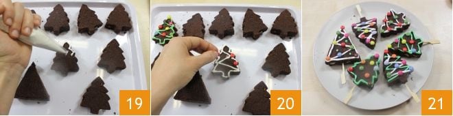 Decore ahora los arbolitos dibujando en la superficie de cada uno líneas en zigzag, o delineando el contorno 19. Coloque finalmente las perlas de colores sobre la glasa aún fresca 20, para que se queden pegadas. Finalmente tome unos palitos de madera y colóquelos en la base de cada árbol 21; si lo desea, complete con una espolvoreada de azúcar glas.