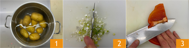 Para preparar el pastel de patatas, lo primero que debes hacer es cocinar las patatas con piel 1. Comienza desde agua fría y una vez que llegue a ebullición, cocina durante 25-30 minutos. Mientras tanto, corta los cebollinos en cubos de 0,5 cm 2. Corta los pimientos y elimina las semillas y los filamentos internos 3.
